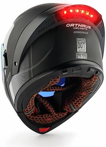 【Design advantages】: Orthrus helmet can switch between full-face helmet and open face helmet with one click. Streamlined aerodynamic design helps reduce wind resistance and noise. Multiple vents facilitate air circulation . The helmet is equipped with an LED light with 3 flashing modes to ensure safety at night.