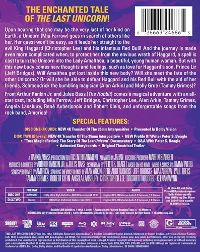 Upon hearing that she may be the very last of her kind on Earth, a Unicorn (Mia Farrow) goes in search of others like her. Her quest won’t be easy, as it leads her straight to the evil King Haggard (Christopher Lee) and his infamous Red Bull! And the journey is made even more complicated when, to protect her from the envious wrath of Haggard, a spell is cast to turn the Unicorn into the Lady Amalthea, a beautiful, young human woman. But with this new body comes new thoughts and feelings, such as love for Haggard’s son, Prince Lir (Jeff Bridges). Will Amalthea get lost inside this new body? Will she meet the fate of the other Unicorns? Or will she be able to defeat Haggard and his Red Bull with the aid of her friends, Schmendrick the bumbling magician (Alan Arkin) and Molly Grue (Tammy Grimes)?